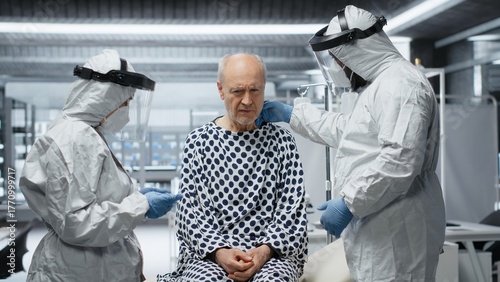 Doctors in hazmat suit monitoring patient vitals during an outbreak, collecting laboratory data and ensuring infectious epidemic containment to avoid a global disaster or crisis. Camera B.