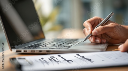 Documentation and Record-Keeping: Hand Signing a Paper near Laptop, Emphasizing Accountability, Compliance, and Detailed Data Management for Business