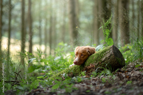 dog in the forest, walk with a pet. Spring mood
