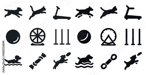 Dog training solid icons set – filled, silhouette, pet obedience visuals