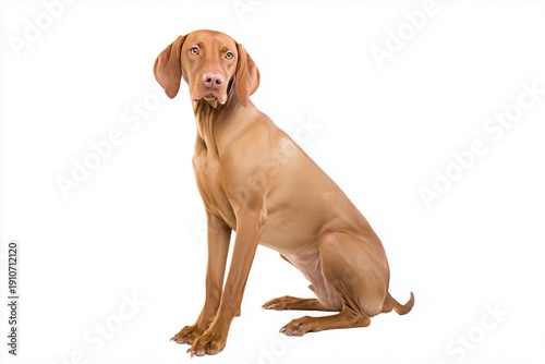 Dog Vizsla sitting calmly on a white background during a photo shoot for pet-related content or advertisements