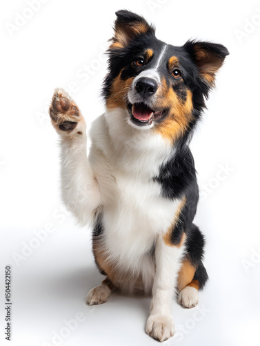 Dog with black, brown, and white fur sits and raises paw in a cheerful manner against a clean white backdrop