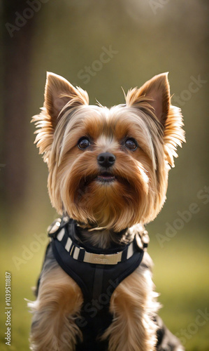 Dogs. Yorkshire Terrier. Dog in a beautiful harness, collar.