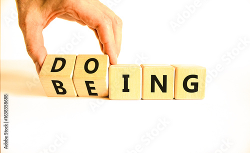 Doing or being symbol. Concept word Doing and Being on wooden cubes. Businessman hand. Beautiful white table white background. Business doing or being concept. Copy space.