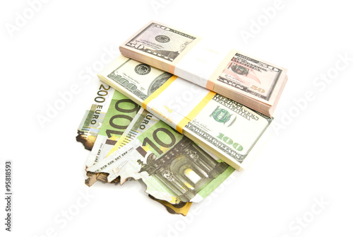 dollars and burned euros bills on white