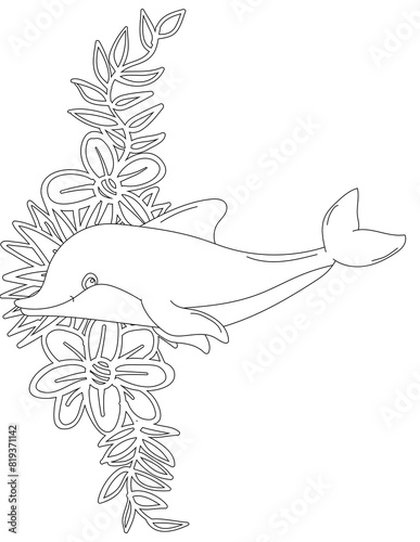 Dolphin and A Floral Vine Coloring Page. Printable Coloring Worksheet for Adults and Kids. Educational Resources for School and Preschool.