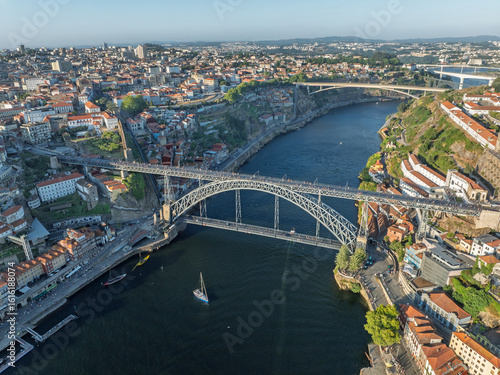 Dom Luis Bridge in Porto City, Portogal. Drone. Douro River. Downtown in Background