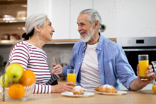 Domestic Morning. Happy Senior Spouses Chatting And Laughing During Breakfast In Kitchen