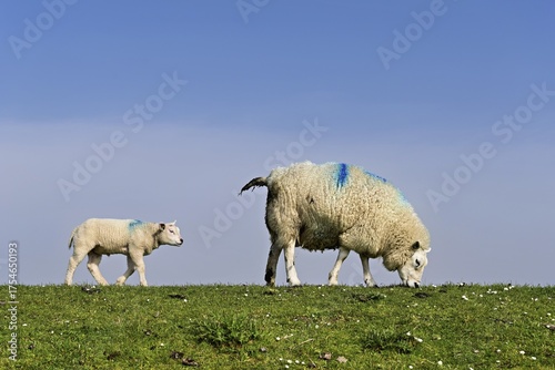 Domestic sheep (Ovis aries), mother with lamb standing in a meadow, Texel, North Holland, Netherlands