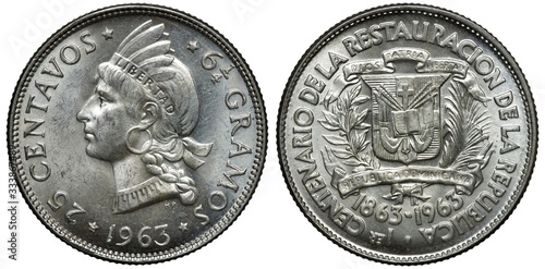 Dominican Republic silver coin 25 twenty five centavos 1963, subject Restoration of Republic, denomination and weight flank Indian head, shield with book between ribbons,