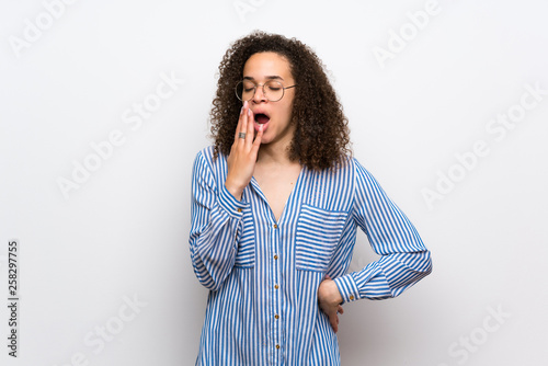 Dominican woman with striped shirt yawning and covering wide open mouth with hand