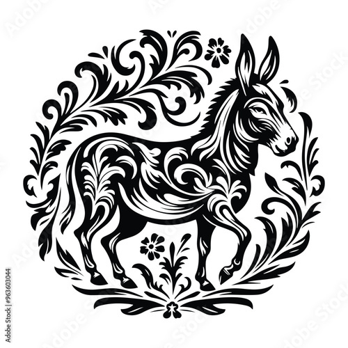 Donkey with victorian flourish decoration, stencil logo, black and white animal illustration