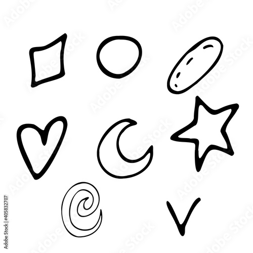 Doodle different shapes. Vector heart, star, moon, rhombus, circle, oval, jackdaw. Hand drawing.
