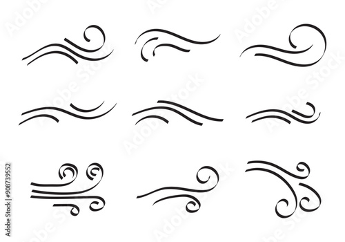 Doodle wind line sketch set. Hand drawn doodle wind motion, air blow, swirl elements. Sketch drawn air blow motion, smoke flow art, abstract line. Isolated on white background . vector illustration.