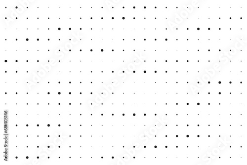Dot grid halftone seamless pattern. Different sized round points background. Abstract monochrome retro texture. Dotty perforated surface. Vector graphic illustration.