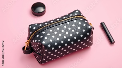Dotted Cosmetic Bag, Black Leather, Pale Pink Background, Fashion Accessory