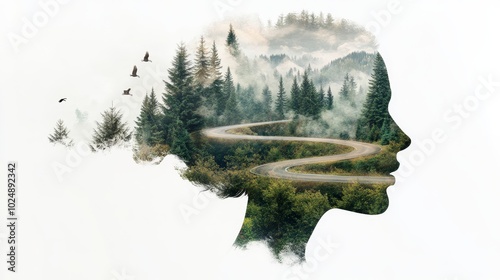 Double exposure of a woman ™s profile with a forest and a winding road cool green hues, on white background