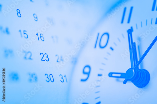 double exposure of analog clock and calendar with blue gradient color