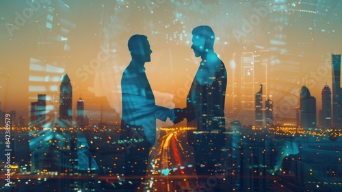 Double exposure of arab Business man handshake to his business partner with digital graphic against city night background in meeting