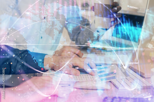 Double exposure of businessman working on laptop on background. International business hologram in front. Concept of success.