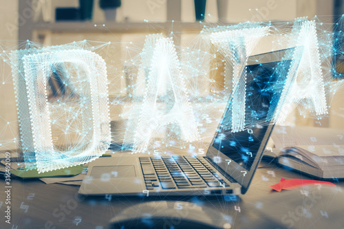 Double exposure of computer and technology theme drawing. Concept of innovation.
