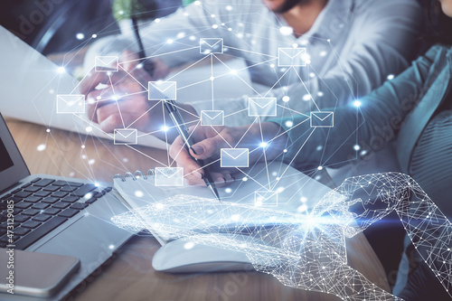 Double exposure of envelop drawing over people taking notes background. Concept of electronic connection