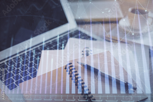 Double exposure of financial chart drawing and desktop with coffee and items on table background. Concept of forex market trading