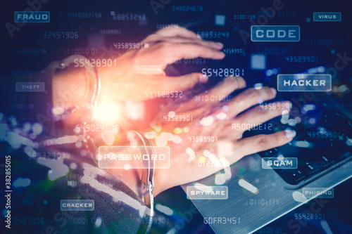 Double exposure of hacker hands in handcuffs