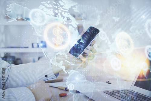 Double exposure of man's hands holding and using a digital device and forex graph drawing. Financial market concept.