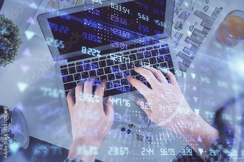 Double exposure of man's hands typing over laptop keyboard and forex chart hologram drawing. Top view. Financial markets concept.