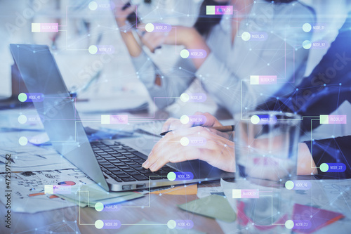 Double exposure of woman hands working on computer and data theme hologram drawing. Tech concept.