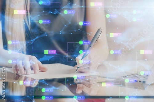 Double exposure of woman's writing hand on background with data technology hud. Big data concept.