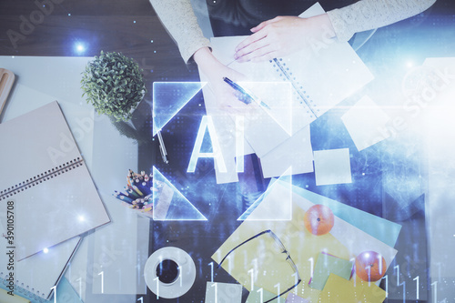 Double exposure of writing hand on background with data solution technology hologram. Ai concept.