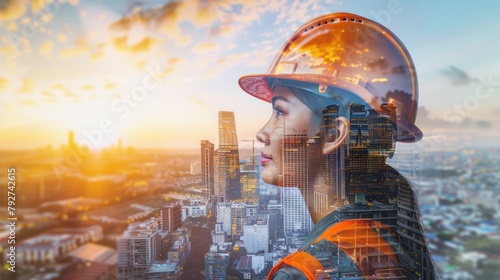 Double exposure of young construction worker woman with safety helmet and modern cityscape view on background. Construction industry concept.