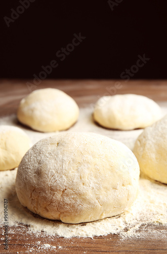 Dough balls for pizza on floured wooden board