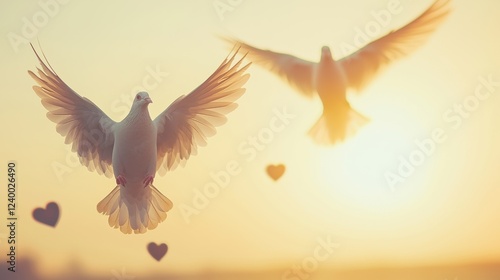 Doves soaring in sunset outdoor setting nature photography romantic atmosphere uplifting viewpoint