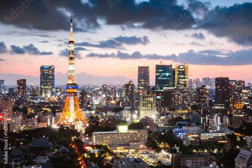 Downtown city skyline at dusk, Tokyo, Japan