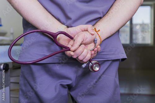 Dr. hands behind his back holding stethoscope