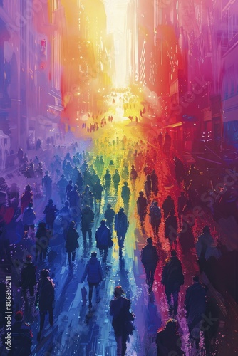Dramatic aerial view of a crowded festival street, painted in the colors of the trans flag, illustration style, in straight front portrait minimal.