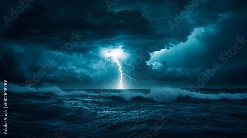 Dramatic and intense image capturing the raw power and collision of natural forces as lightning streaks across the sky over a tumultuous stormy ocean scene