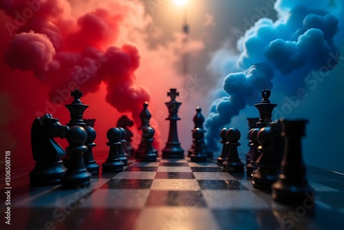 Dramatic chess scene with black and white pieces surrounded by red and blue smoke.