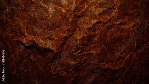 Dramatic close up of weathered leather with deep creases and grainy texture under intense lighting