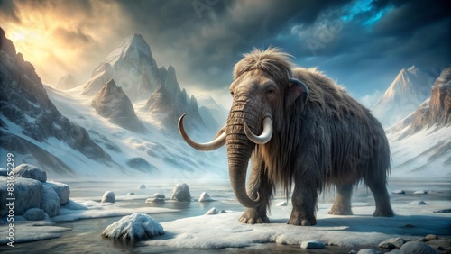 Dramatic close-up of a majestic wooly mammoth standing alone in a serene, snow-covered Arctic tundra landscape at dawn.