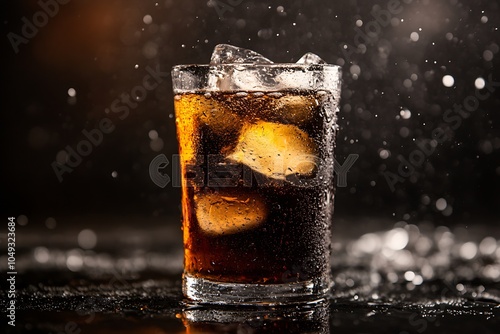Dramatic closeup of iced cola splashes against dark background for dynamic beverage marketing visuals : Generative AI