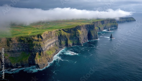 Dramatic coastal cliffs meet a churning sea, shrouded in mist