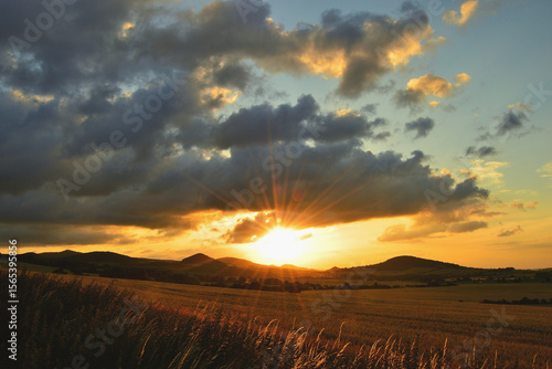 Dramatic Colorful Sunrise Light Dark Clouds Over Czech Central Mountains