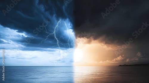 Dramatic Contrast of Stormy and Sunny Skies Over Tranquil Ocean Waters with Lightning Striking the Clouds and Sun Setting on the Horizon