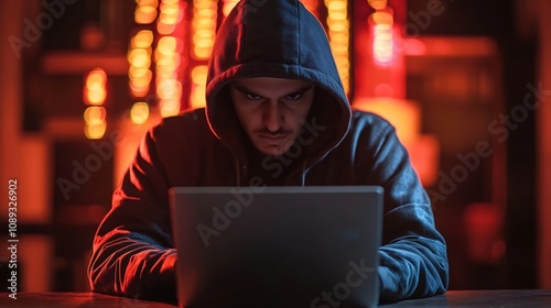 Dramatic documentary style image of a cybercrime scene with a hooded hacker using a laptop in a dark and moody digital environment with dramatic lighting and shadowy ominous atmosphere