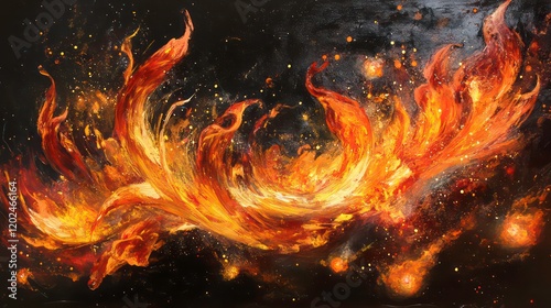 Dramatic flames and sparks swirl upward in an arresting scene, evoking dynamics of transformation, energy, and the elemental force of fire.