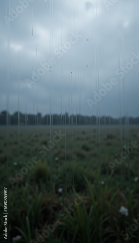 Dramatic Landscape with Moody Sky and Rain Lines Over Lush Green Field Creating Ethereal Atmosphere